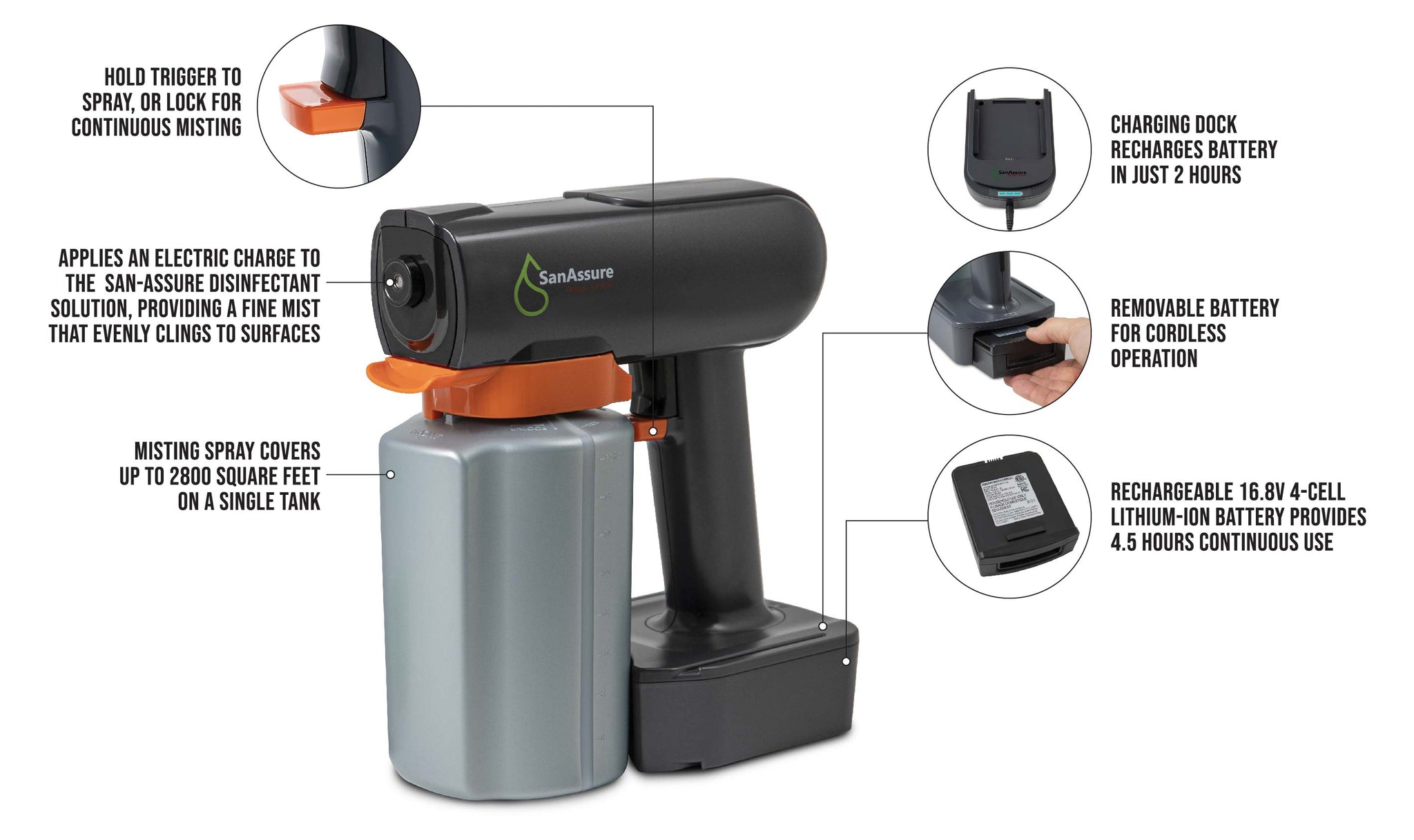 The San-Assure Electrostatic Sprayer is the perfect addition to your home or small business cleaning routine. Coupled with San-Assure’s EPA-registered disinfecting solution, your electrostatic sprayer allows you to thoroughly coat and sanitize all surfaces quickly and efficiently. *Please refer to manual and product label for manufacturer's instructions.*