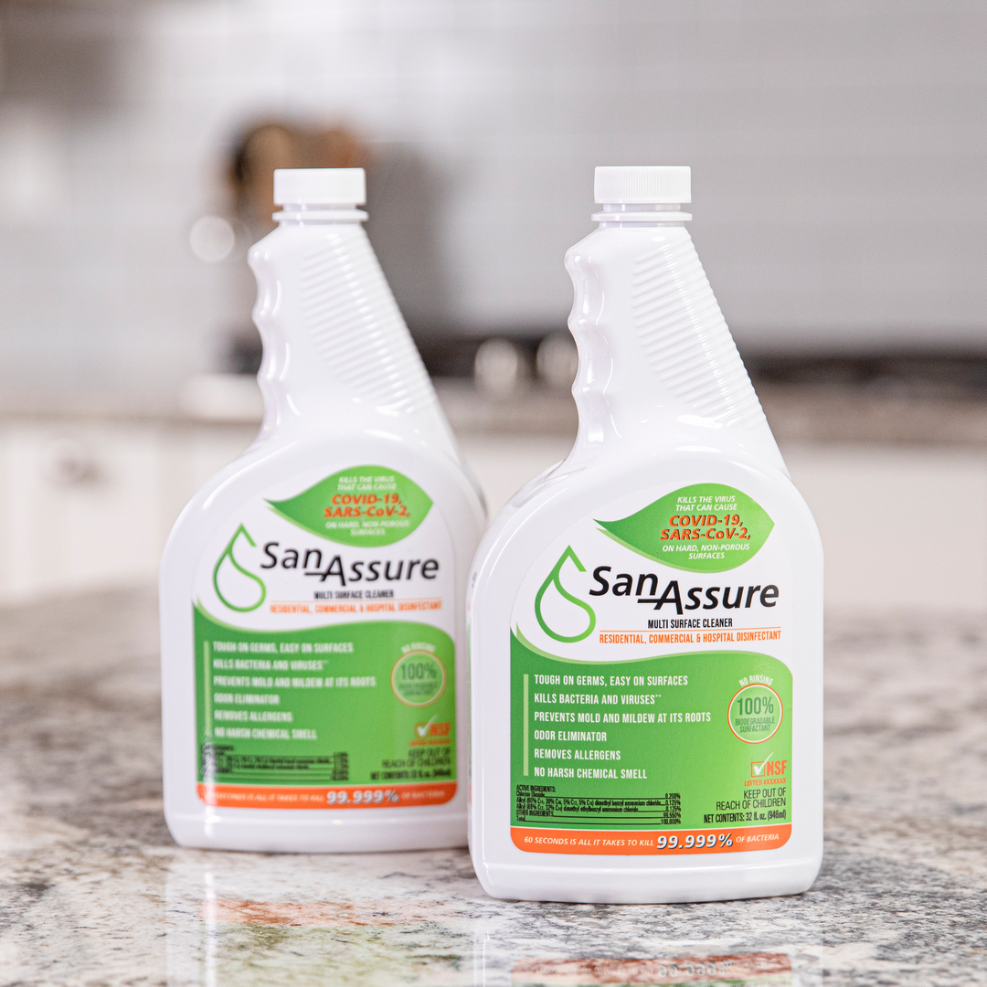 San-Assure provides multi-surface cleaning solutions that allow you to disinfect and sanitize every surface in your home. Our EPA-Registered sanitizer is safe to use and our electrostatic attraction technology provide full coverage disinfecting.